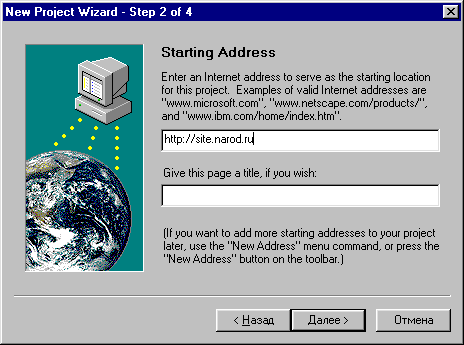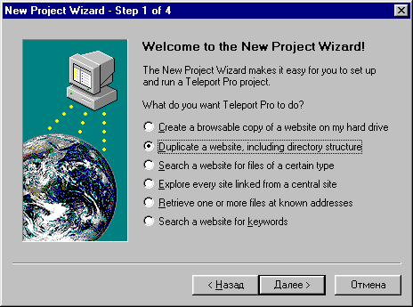 Также иногда могут скачиваться вместе с сайтом и директории с названиями типа "Gh5hNHdgvj5", которые тоже могут содержать рекламные скрипты, которые чаще всего имеют аналогичные названия. Удаляйте и их. НЕ ПЕРЕПУТАЙТЕ ИХ С НУЖНЫМИ ФАЙЛАМИ И ПАПКАМИ! После удаления зайдите на всякий случай в корзину и выполните поиск файлов с расширениями .htm, .html. Необходимые файлы восстановите. И только после того, как проверены все внутренние ссылки, можно считать спасение сайта завершенным. Виды поддоменов отреставрированных сайтов: site.narodweb.ru - сайты с narod.ru Скачивание сайта целиком на примере двух программ: Teleport Pro и Wget: Teleport Pro1. Скачиваем и устанавливаем программу. 2. Создаём новый проект.